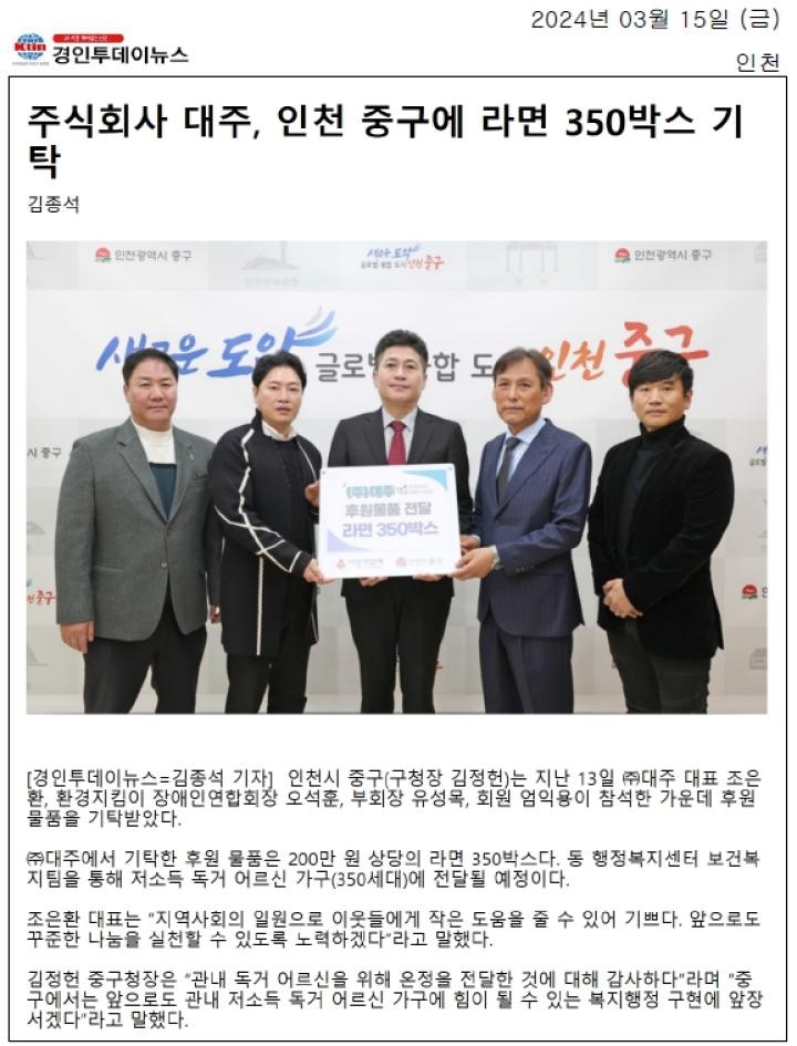 지역사회의 일원으로 저소득 독거 어르신들을 위해 지원합니다. (인천시 중구청)